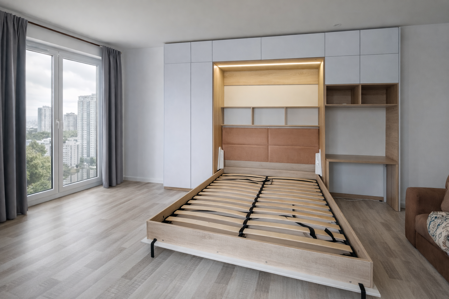 Особенно актуальны горизонтальные шкафы-кровати в современных квартирах-студиях. Чтобы заказать шкаф-кровать в городе Новосибирске оформите заявку на сайте или свяжитесь с менеджером, и мы вам перезвоним. Уверены, вы останетесь довольны.